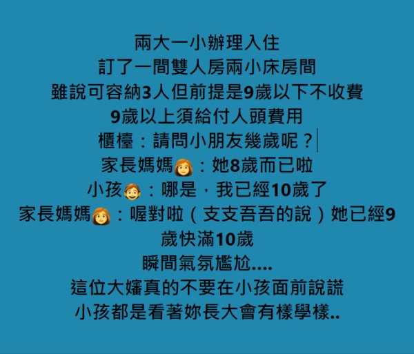 原PO替客人辦理入住時,告知訂房的媽媽「9歲以上須給付人頭費用,請問小朋友幾歲呢?」媽媽當時馬上回答「她8歲而已啦~」想不到下秒孩童馬上打臉媽媽,說「哪是!我已經10歲了!」