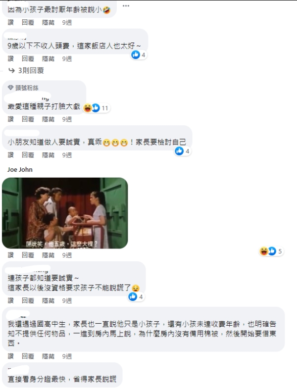 貼文曝光後,底下網友紛紛回應,「最愛這種親子打臉大戲」、「小朋友知道做人要誠實,真乖,家長要檢討自己」、「連孩子都知道要誠實~這家長以後沒資格要求孩子不能說謊了」。此外,還有些網友大讚飯店佛心,「9歲以下不收人頭費,這家飯店人也太好」、「很少9歲不收人頭費的」。