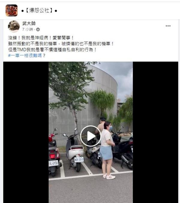 原po在臉書社團「爆怨公社」發文,「沒錯!我就是神經病、愛管閒事!雖然搬動的不是我的機車,被擠傷的也不是我的機車,但是TMD我就是看不慣這種自私自利的行為!一車一格很難嗎?」