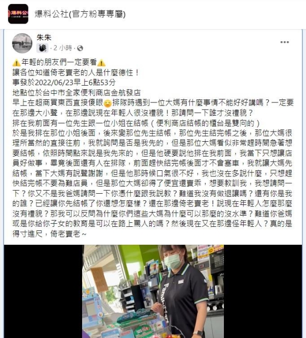 該名女網友在臉書社團「爆廢公社」發文表示,她日前去超商結帳,因人太多而排隊許久,沒想到輪到她時竟被一名大媽插隊;原PO想都不想,立刻將手上要購買的物品放在櫃臺,對店員說,「還有這些要結,我們一起的」,並用手指著插隊大媽說,「她付錢」。