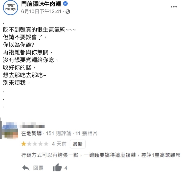 「門前隱味牛肉麵」的老闆臉書粉專發文,回覆了該則1星評論「吃不到麵真的很生氣氣齁,但請不要誤會了,你以為你誰? 再複雜都與你無關,沒有想要煮麵給你吃,收好你的錢,想去那吃去那吃~別來煩我。」