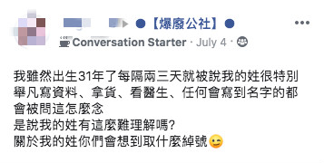 有位網友在臉書「爆廢公社」發文,抱怨自己出生31年以來,每隔兩三天,總是會有人說她的姓氏很特別,「不管是寫資料、拿貨、看醫生,只要是有填寫名字的,我都會被問這怎麼唸」,讓她有點崩潰地詢問:「是說我的姓有這麼難以理解嗎?」