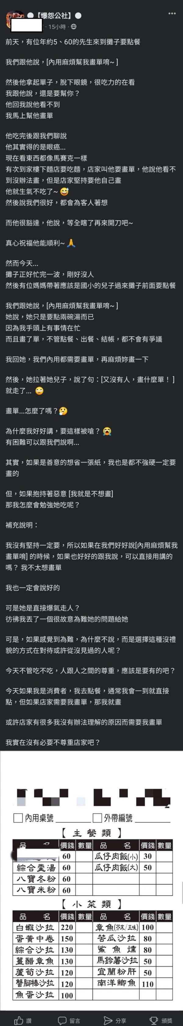 「我曾經在買外帶的時候,遵守店家的規定,畫單外帶,結果我在畫的過程....已經有三組客人用嘴巴畫完單了,而我乖乖遵守卻變成第三組客人。」