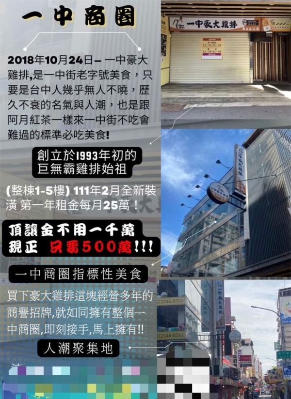 ▼一中豪大雞排曾接受過不少美食節目採訪,在一中商圈是指標排隊名店,不少外國遊客來台也會朝聖。目前老闆轉當屋主後開出5層樓第一年月租25萬,加上店面頂讓金500萬,因為店家名氣響亮,客源又比較穩定,消息在臉書曝光後就有不少民眾前來洽詢。