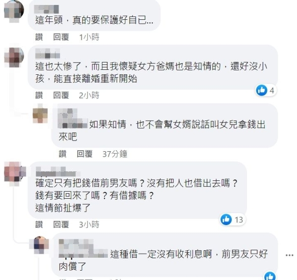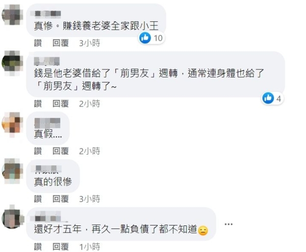 另一派網友則怒轟,「錢是他老婆借給了前男友週轉,通常連身體也給了『前男友』週轉了」、「跟前男友聯絡是什麼概念」、「X的,幫別人養了五年的老婆」、「難怪沒生,怕不知道孩子的爹是誰吧」、「好可憐,養別人的老婆就算了還養小王」、「這也太慘了,而且我懷疑女方爸媽也是知情的,還好沒小孩,能直接離婚重新開始」。