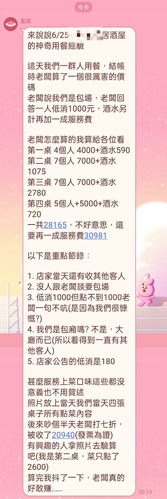 原PO在文內附上當時用餐時的的帳單及菜單,上面總金額是20940元,怒斥「真當我們盤子?菜單金額跟消費金額不符合」,且重點原PO表示當時店內還有其他顧客,並無包場,也完全不知道有低消的事情,另外也抱怨出菜速度慢,當時最後一道上完已過去2個半小時,如果要吃到低消1000元,不知道要花多少時間才能上菜「我們只是去吃飯,不是花錢去那邊耗時間」。
