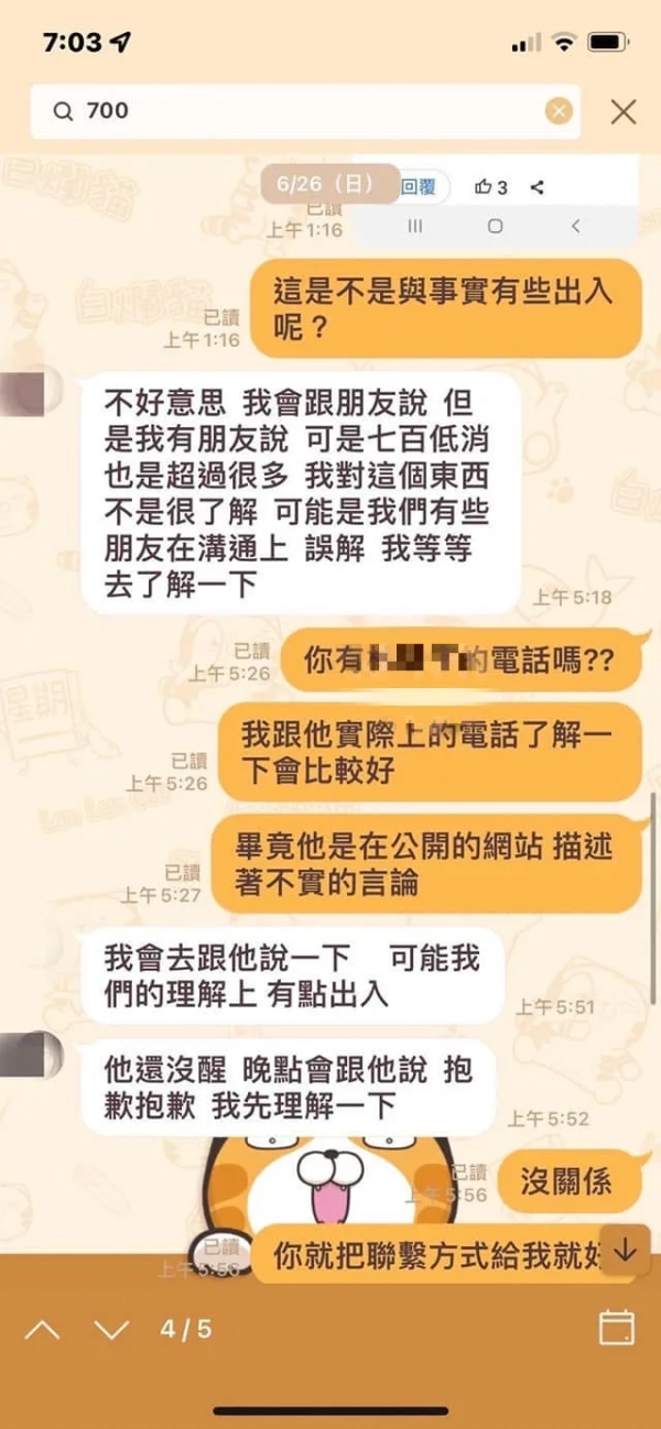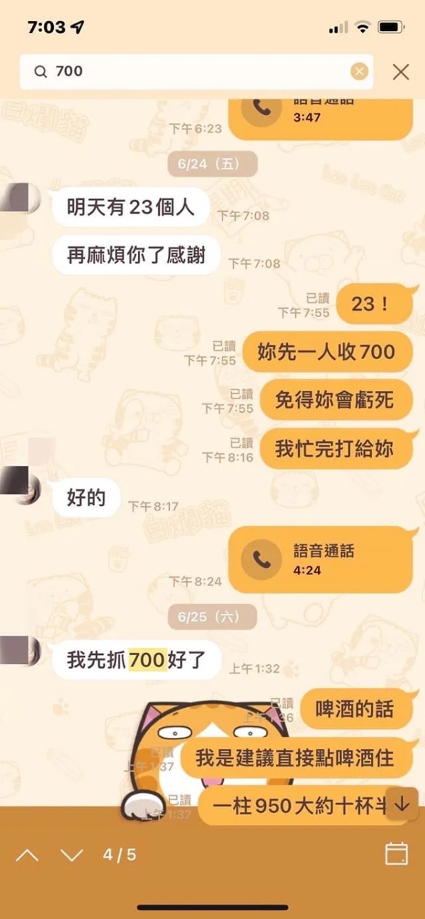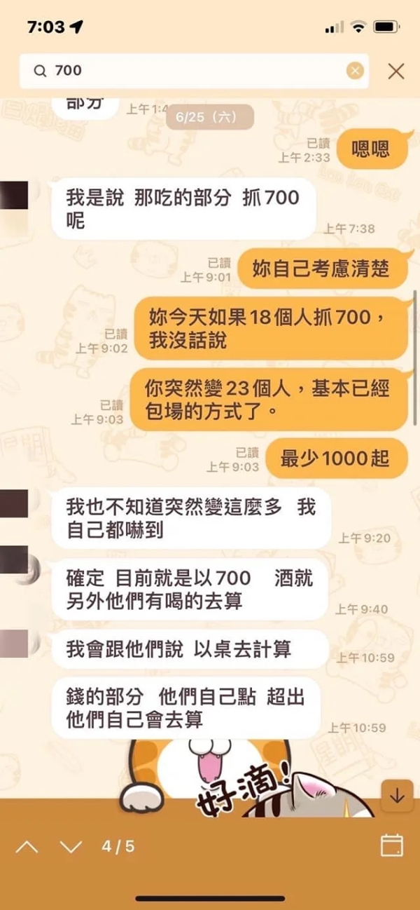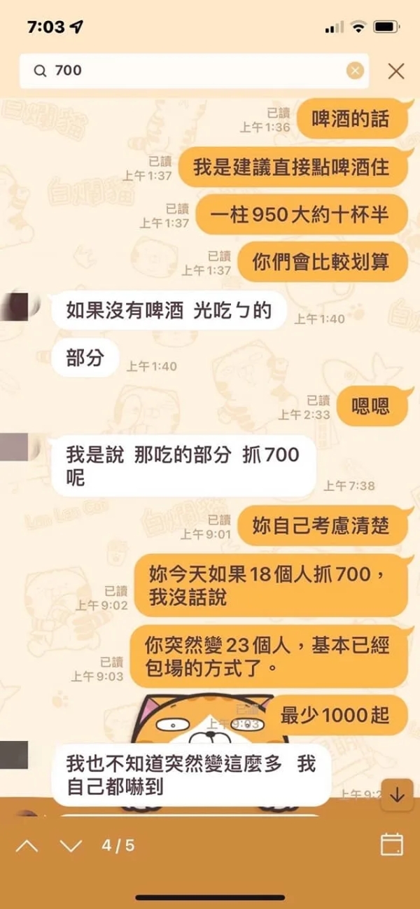 店家表示,由於店內非自助式,因此來店用餐一率加收一成服務費,並澄清原PO當初預約僅告知有18人,且已已協調好每人700元預算,但最後卻多增加4人;為了證明所言不假,店家也附上與客人的對話紀錄以茲證明。