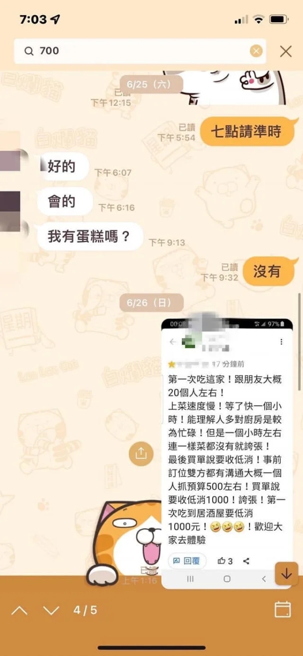 原PO氣憤的表示,他認為店家「沒服務也敢收(服務費)」,並說明最後與店家協商,改以每人700元低消計算。