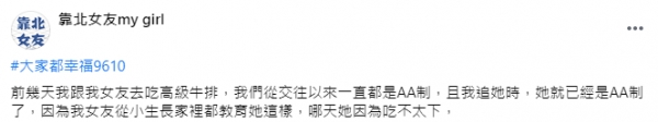 且女友從小到大的是接受「AA制」的教育。