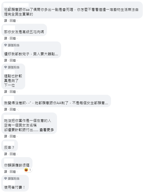 「還好我都教兒子,男人要大器點....」、「我覺得沒差欸- -”,她都願意跟你AA制了,不是每個女生都願意....」、「A你妹累不累啊!單身不會!」、「要AA制的都別談戀愛了,一堆為了一塊兩塊的在計較」、「你還是憑實力單身吧」、「你出是會怎樣?錢是身外之物!」