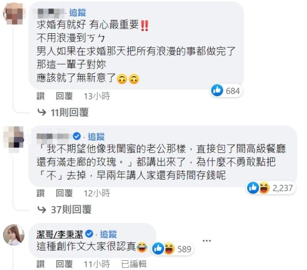 網紅「潔哥」李秉潔也在留言笑虧,「這種創作文大家很認真」,其他網友也回應「認真就輸了」、「仇女的太多了,沒辦法」、「我怎麼覺得真的有這種人」。