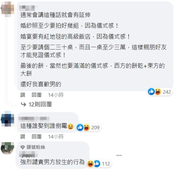 一名女網友在《匿名公社》抱怨,上週男友在一間普通餐廳裡求婚,拿出浮誇的1克拉鑽戒以表心意,怎料原PO卻一臉不爽,她認為缺少了儀式感與浪漫氛圍,「只在普通的簡餐廳和邀幾個比較好的朋友,佈置上也只有幾顆氣球和幾束花...說過很多次了,一生一次的求婚,我想要浪漫一點的,可以讓我感動的那種」,好讓她以後能回憶,並向孩子炫耀,「爸爸以前對我有多好!」