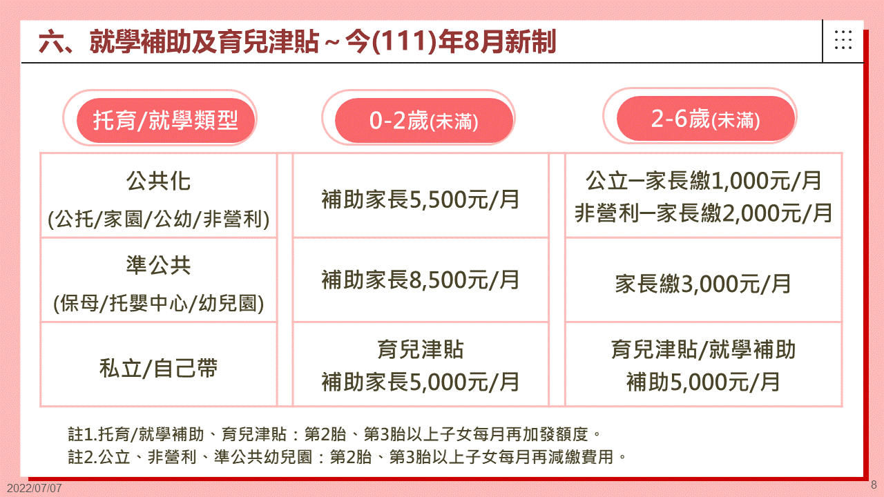 教育部指出,今年8月起,家長自己帶或就托未加入準公共的私立托嬰中心或私立幼兒園的小朋友,第1胎育兒津貼每月發放額度提高到5,000元,第2胎每月6,000元、第3胎以上每月7,000元。