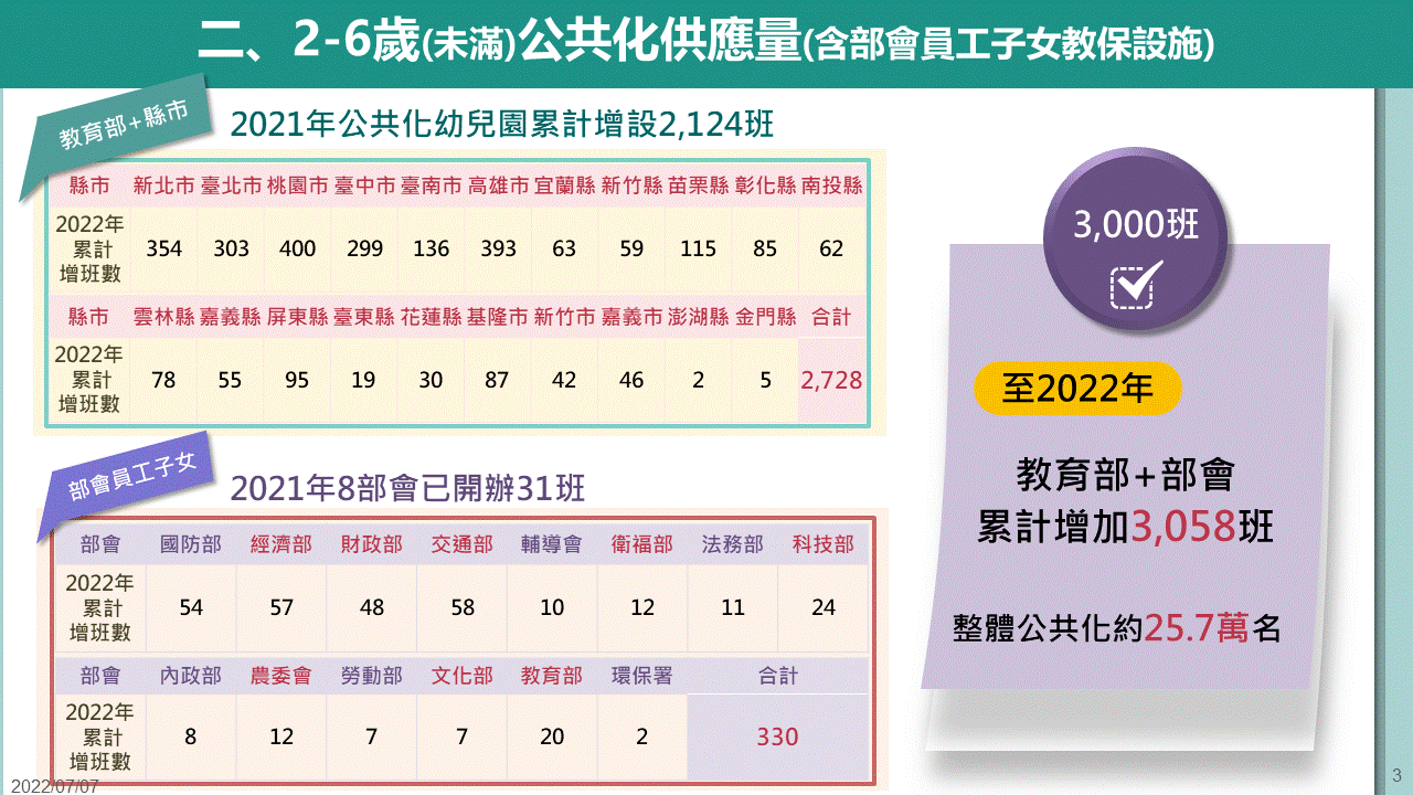 1.公共化幼兒園提前於今年達成增設3000班的目標:教育部除了與地方政府共同合作,持續增加公立及非營利幼兒園外,行政院為了鼓勵政府機關(構)營造友善職場環境,也請教育部協助各機關(構)設置員工子女的教保服務設施,去年已經有8個部會設置31班,預計今年開辦後將達到330班,讓員工可以就近托育子女,衡平工作職場及家庭照顧需求。至今年教育部與地方政府合作增設的公共化幼兒園累計2728班,加計政府機關(構)設置的員工子女教保服務設施,增設3058班,整體公共化供應量可達25.7萬個名額。