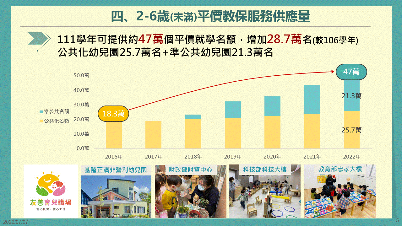 在「增名額」部分,教育部規劃「擴大平價教保服務量」,此共分為0至2歲(未滿)及2至6歲(未滿)區間。第一、0至2歲(未滿):至今年6月累計增設公共化托育342處,可提供約1.1萬個名額;有簽定準公共契約的居家式托育(保母)及私立托嬰中心提供約8萬多個名額;整體0-2歲(未滿)平價名額約9.1萬名,家外送托率已成長至17.3%,較2016年提高約7%。