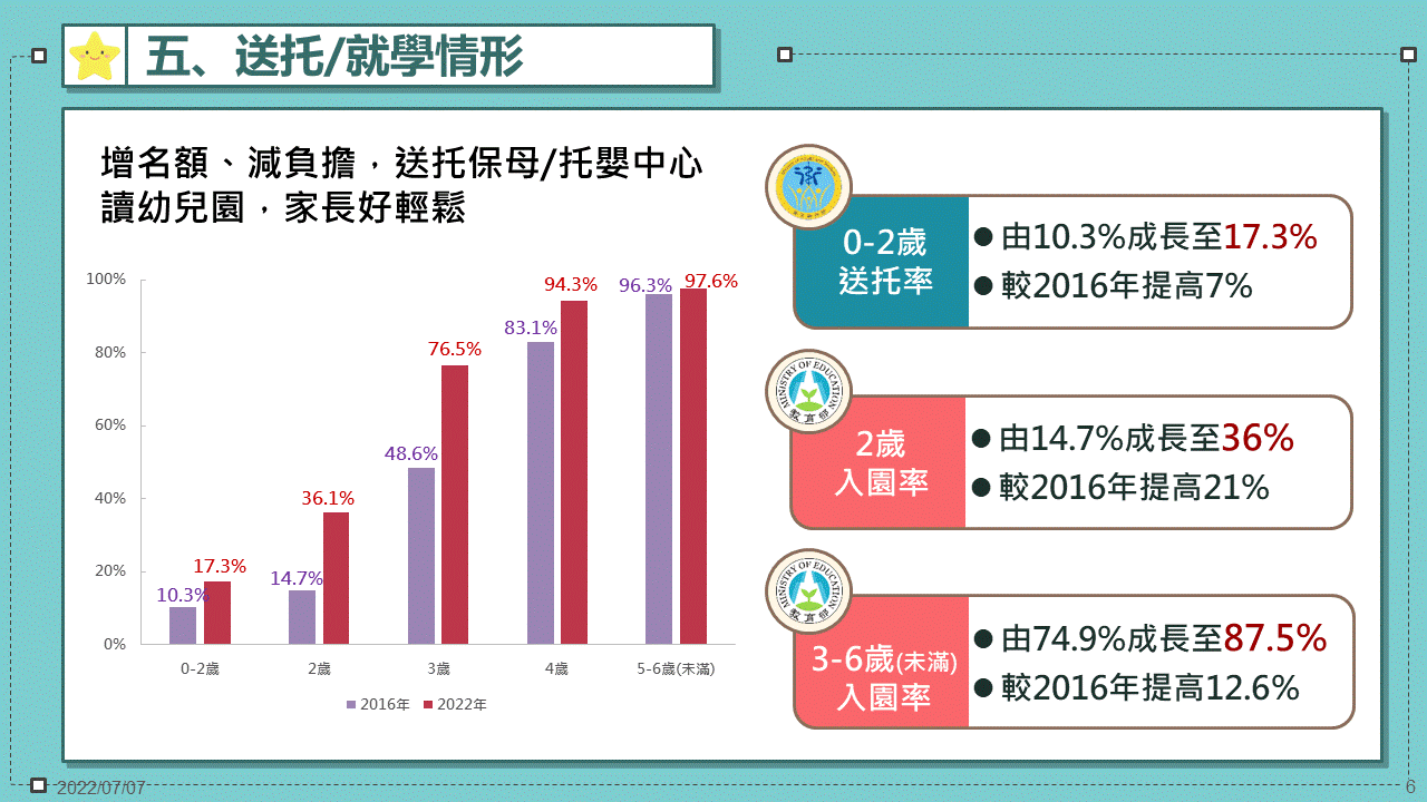 4.透由各項政策的協助,今年整體幼兒入園率再提高,2歲達36%,較2016年提高21%、3歲至6歲(未滿)達87.5%,較2016年提高12.6%,顯見政策有助於提升家長讓幼兒入園的意願,有助於維護幼兒的權益。