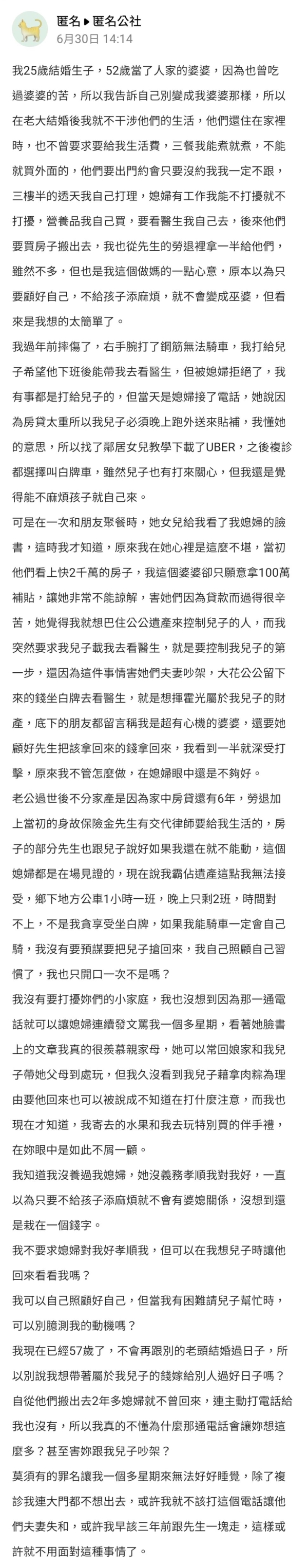 老公過世後不分家產是因為家中房貸還有6年,勞退加上當初的身故保險金先生有交代律師要給我生活的,房子的部分先生也跟兒子說好如果我還在就不能動,這個媳婦都是在場見證的,現在說我霸佔遺產這點我無法接受,鄉下地方公車1小時一班,晚上只剩2班,時間對不上,不是我貪享受坐白牌,如果我能騎車一定會自己騎,我沒有要預謀要把兒子搶回來,我自己照顧自己習慣了,我也只開口一次不是嗎?