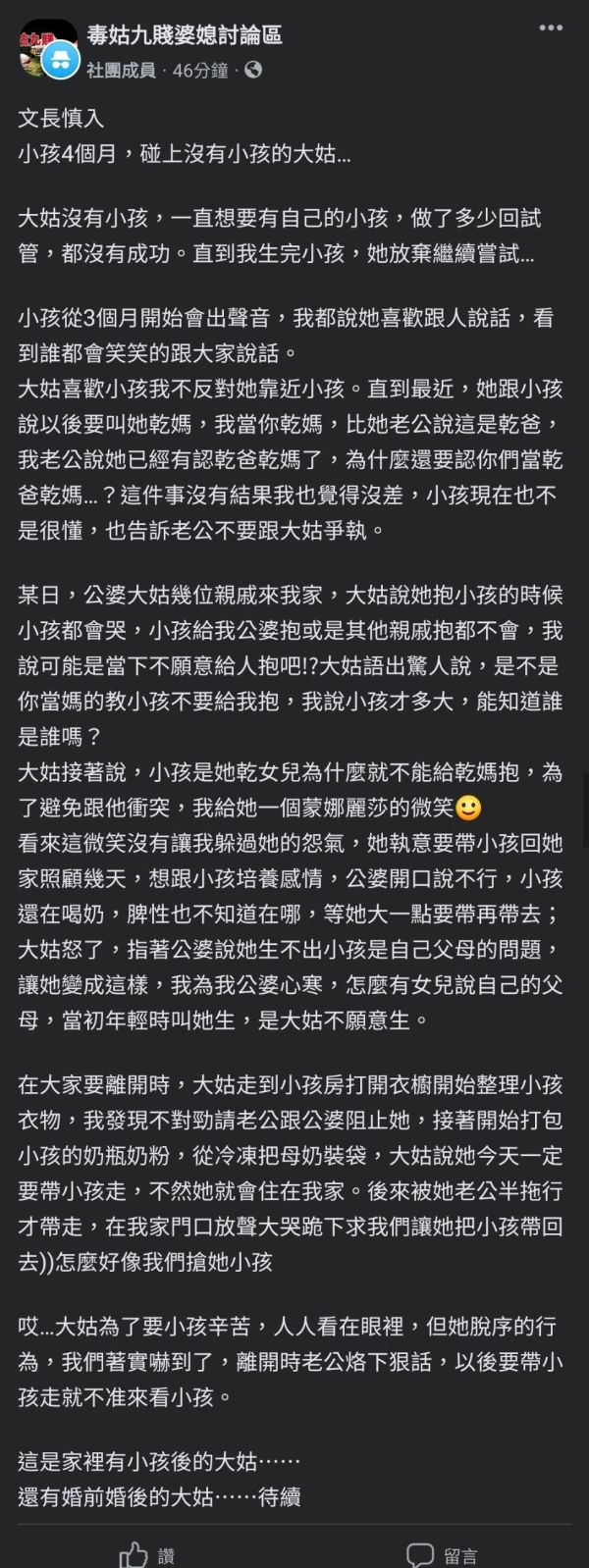 這件事沒有結果我也覺得沒差,小孩現在也不是很懂,也告訴老公不要跟大姑爭執。