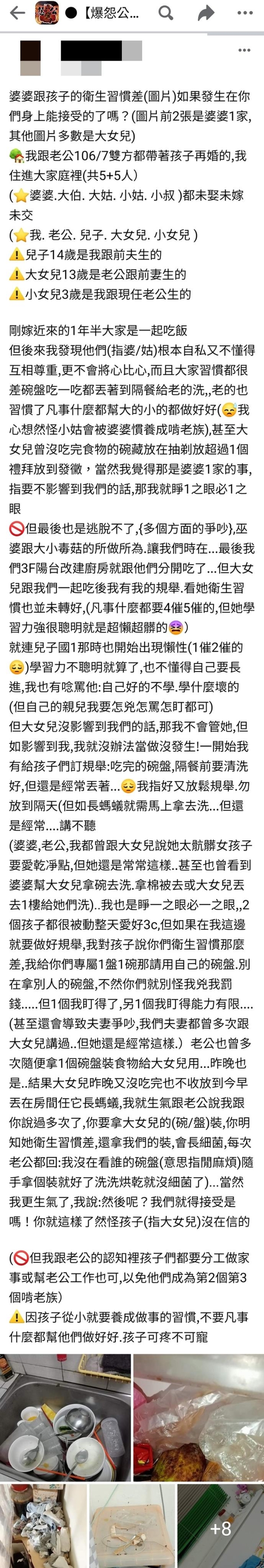 有社員就在爆怨公社發文表示,她跟先生在106/7,雙方都帶著孩子再婚的,然後就住進了5+5人的大家庭。