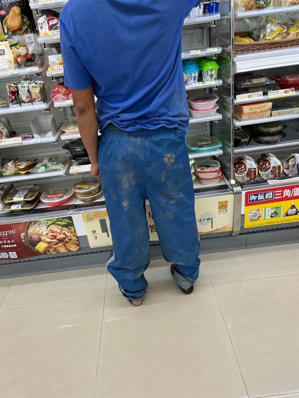 這位男子打扮的相當「有個性」讓PO主都忍不住多看了幾眼,并且把對方的照片拍了下來。照片中清晰可見,這位男顧客,穿了一條沾滿污漬的長褲,上衣也很臟,再一看腳,他竟然沒有穿鞋!