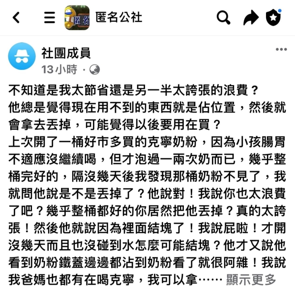 上次開了一桶好市多買的克寧奶粉,因為小孩腸胃不適應沒繼續喝,但才泡過一兩次奶而已,幾乎整桶完好的,隔沒幾天後我發現那桶奶粉不見了,我就問他說是不是丟掉了?