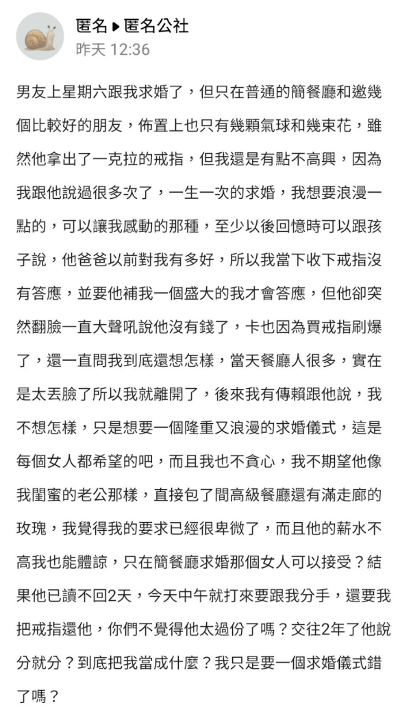 有網友在爆料公社app中的匿名公社,發文表示,已經多次跟男友提及,想要有個浪漫又難忘的求婚,雖然男友準備一克拉的鑽戒,但求婚儀式卻簡陋的讓她不開心,她收下戒指要求男友補一個隆重的才要答應求婚,沒想到三天後男友竟提分手,讓她直呼:我錯了嗎?