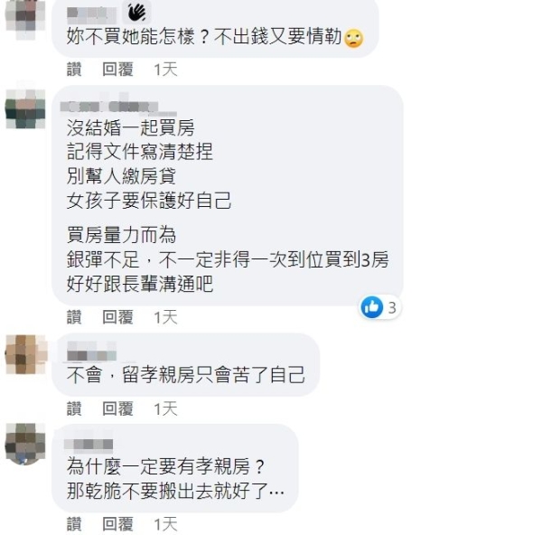 文章曝光後,底下網友搖頭回應,「這問題簡單,媽媽從北部下來,孩子出錢讓媽媽住旅館飯店啊」、「買頂樓阿,媽媽來的時候就能在頂樓搭帳篷了」、「三房的話真的比較好,以後你們有小孩,小孩長大了真的會需要用到,孝親房是能住多久,坦白講就是這樣」、「請她補差價吧」、「可以啊,媽媽拿500萬出來就可以」、「這種親情勒索真的好有壓力,不妨帶媽媽參觀房屋仲介,看清現在的房價,跟以前完全不能比」。