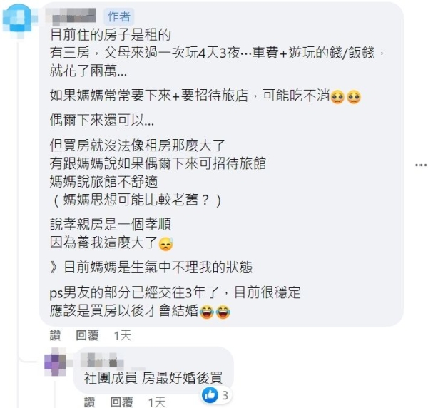 事後,原PO無奈補充,目前與男友租三房物件,「父母來過一次玩4天3夜,車費+遊玩的錢+飯錢,就花了兩萬...如果媽媽常常要下來+要招待旅店,可能吃不消。」至於還沒結婚就買房部分,原PO則回應「我們買完才會考慮結婚!」