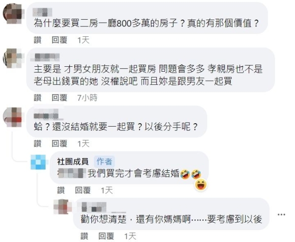 留言串中,不少網友也提醒,「沒結婚不要一起買房」、「還沒結婚就要一起買?以後分手呢」、「沒結婚『一起』買心酸的嗎」、「男朋友...夫妻一起買房都能離婚了,還沒結婚一起買房,勇氣可嘉」、「記得持分登記~至少分手離婚還可以拿一半回來」。