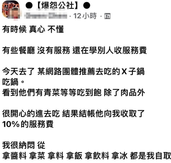 「有時候真心不懂,有些餐廳沒有服務,還在學別人收服務費。」這名陳姓網友在臉書「爆怨公社」發文表示,日前他到知名火鍋店消費,開心用餐完畢,但是結帳時店家收取餐點10%的服務費,但從拿醬料、拿菜、拿料、拿飯、拿飲料、拿冰都是他自取,店員只有端鍋子、端肉品、加湯,剩下都自己弄,真不懂這樣收服務費的意思是?