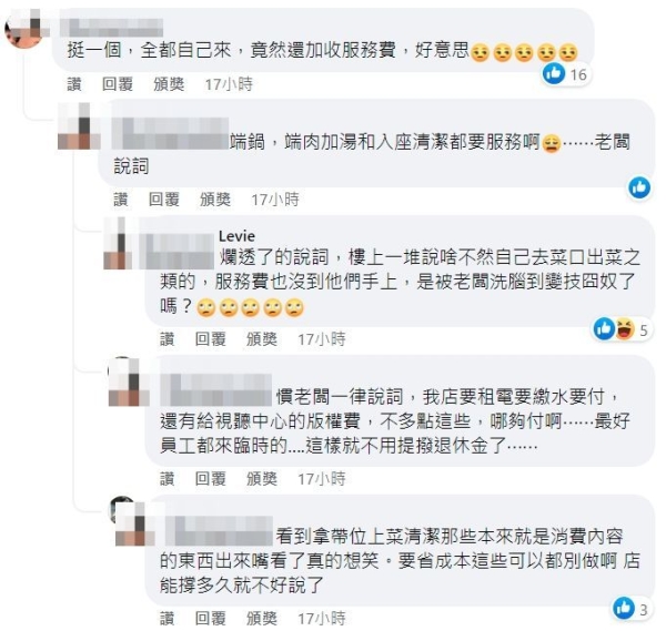 對此,網友附和,「最扯就是吃了100跟吃500的,服務一模一樣收的服務費卻不一樣」、「巧令名目而已,這些錢也不是給服務生」、「其實收服務費如果是給員工,那我非常認同!偏偏台灣的服務費都是進了老闆的口袋!」、「認同+1,除了吃到飽或是有桌邊服務的收10%服務費,一般火鍋收10%我都覺得不合理,提供的飲料、冰淇淋,客人是會吃多少?還有收10%不開發票的