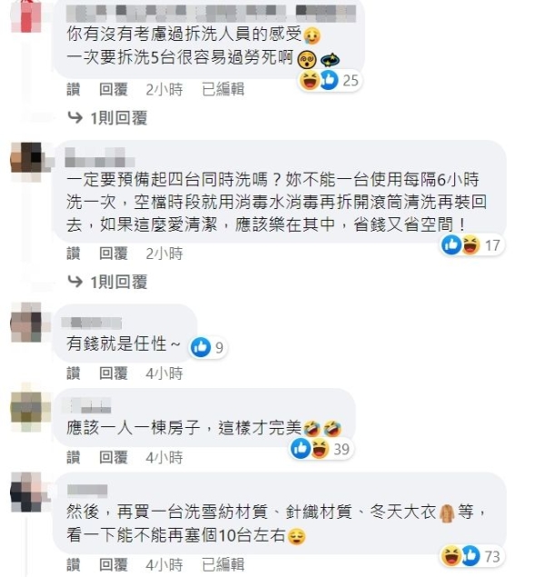 「如果可以的話再多買一台,我想要去妳家洗衣服」、「這潔癖也太嚴重」、