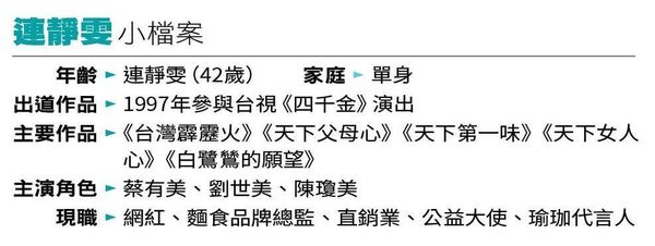 連靜雯有「戲劇女王」稱號,曾參與37部電視劇及5部電影演出,其中,參演三立電視台的《台灣霹靂火》《台灣龍捲風》《天下第一味》《家和萬事興》等高收視8點檔,讓許多觀眾認識她;尤其是她飾演「蔡有美」「劉世美」等壞女人、狐狸精角色,演得非常出色,近來轉換跑道到YouTube頻道,也發展自創麵食品牌「靜享」系列,睽違5年推新作,啦啦隊電影《一起一起》則已開拍