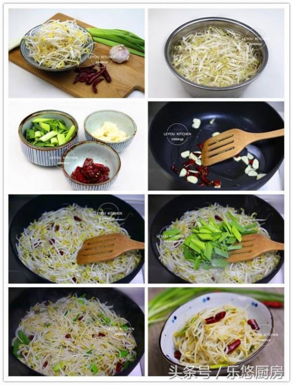 第一步:準備食材。綠豆芽500克、干辣椒幾個、青蒜苗幾根、蒜適量。