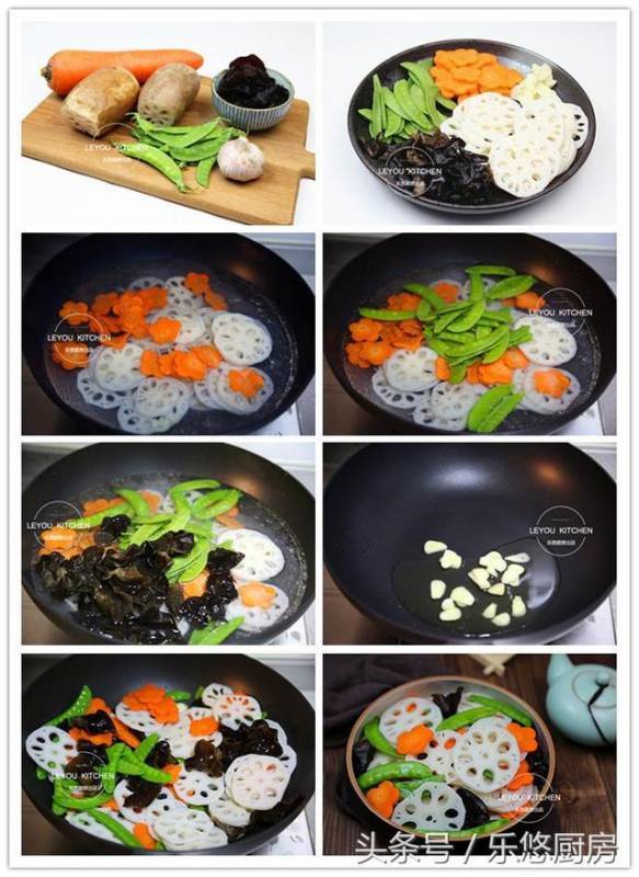 第二步:蓮藕去皮切成薄片、胡蘿蔔切片、木耳撕成小朵、荷蘭豆去掉兩頭的老筋,蒜切片備用。(我把胡蘿蔔用模具壓成花朵形狀,這樣炒出來更好看。)