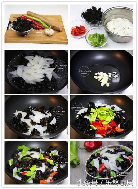 第二步:將山藥去皮切成菱形片,木耳撕成小朵,紅、綠辣椒切片,蒜切片備用。(山藥在處理時,黏液會非常滑手,建議戴上手套操作。另外,山藥切好後要即時放到水中,以免變色。)