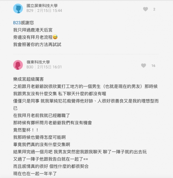 表示自己以前也去拜過2次月老,後來真的成功和喜歡的人交往了,
