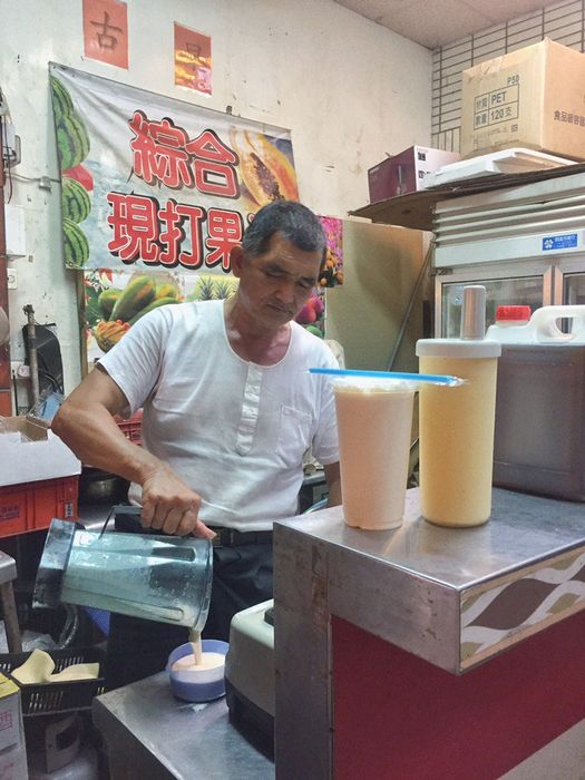 ▼這名女網友表示,這間小攤販就在市場對面,裡面坐著一位阿北。她發現好半天都沒有人光顧,就去點了一杯50元的芒果牛奶,並在旁邊看老闆製作。阿北全程使用天然的芒果和牛奶,沒有加水和糖,喝起來更加醇香。