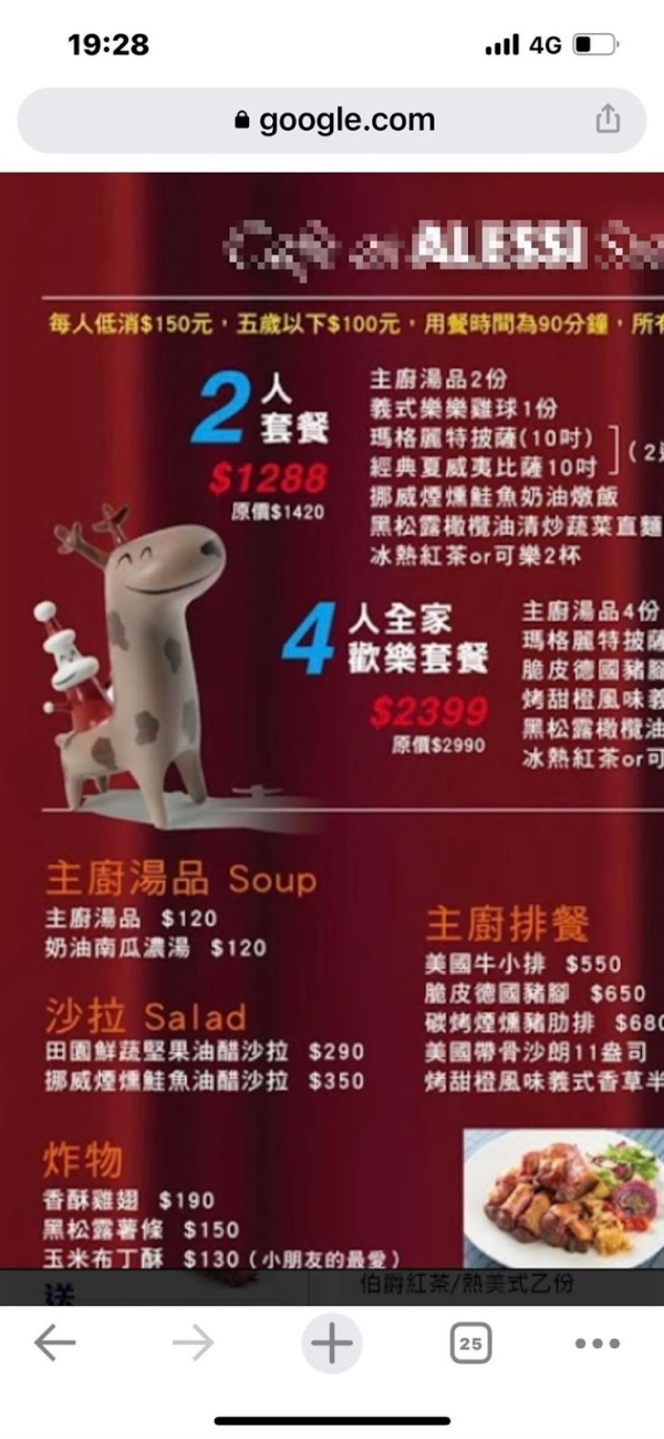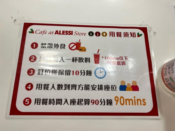 『板橋大遠百9樓ALESSI店內櫃檯上用餐須知寫「不滿100公分不用低消」,但是店員說那是寫錯的「100公分以下也要點180元]飲料哦!」,菜單上面有寫五歲以下要收100元,我聽到之後並沒有繼續用餐,只是提醒大家,有不滿100公分小小孩可以考慮一下。』