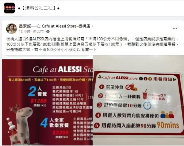 該名家長在臉書社團「爆料公社二社」發文表示,日前帶小孩到新北板橋某百貨公司的餐廳用餐,卻發現店家的低消規定模糊,明明櫃台的用餐須知公告「不滿100公分不用低消」,但店員卻說「那是寫錯的,100公分以下也要點180元飲料」,菜單則寫著「5歲以下收100元」,讓她看了霧煞煞,當下決定帶著小孩離開,沒有繼續消費。