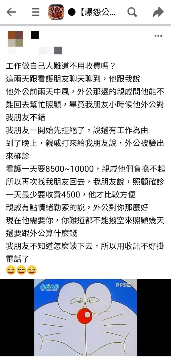 有社員在爆怨公社發文表示,友人擔任看護工,親戚因外公中風又確診,看護費用負擔不起,而要求他回來照顧,他將價格減半提出,卻遭親情勒索:外公對你那麼好!!