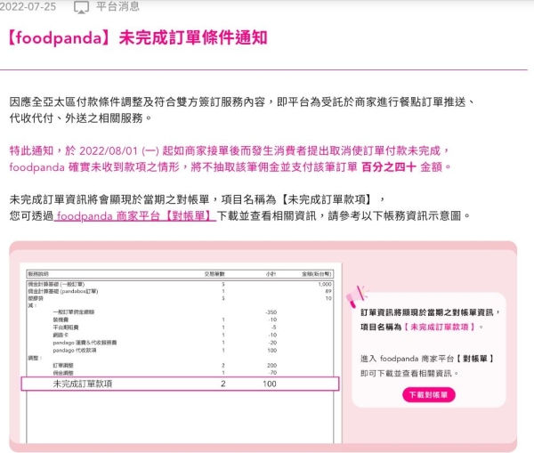 特此通知,於2022/08/01 (一) 起如商家接單後而發生消費者提出取消使訂單付款未完成,foodpanda確實未收到款項之情形,將不抽取該筆佣金並支付該筆訂單百分之四十金額。