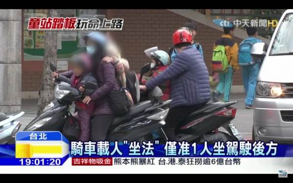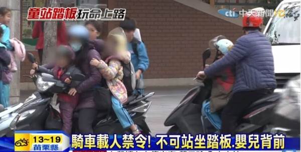 不管是小小孩或是已經會站的孩童都沒戴安全帽;有時坐在最後面的大人,