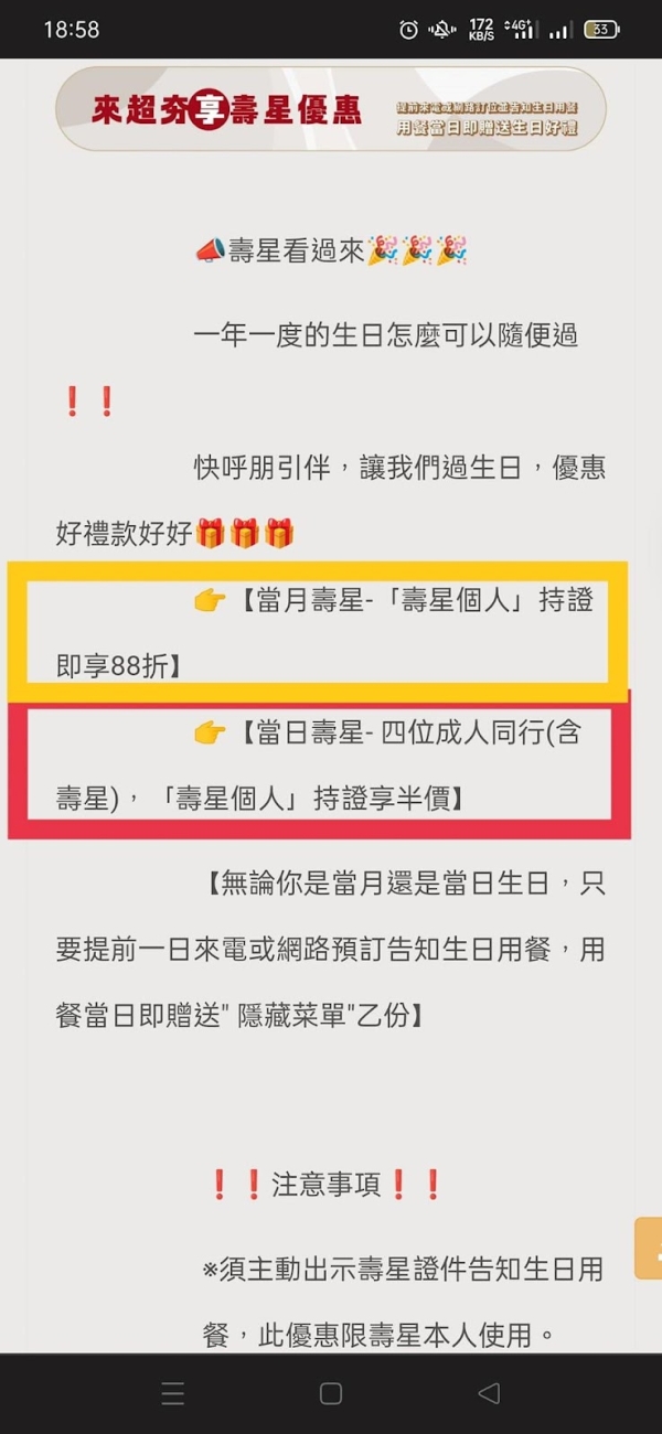 「當日壽星本人」持證並四位成人同行,壽星本人即享五折優惠。