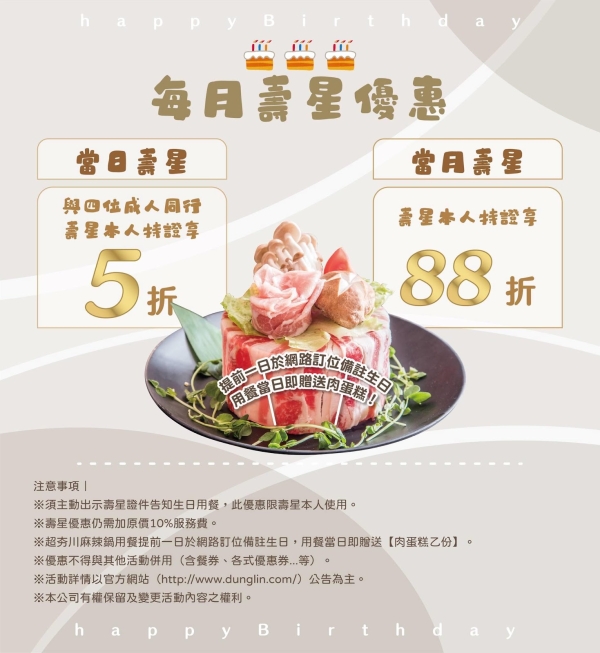 【生日當天四位成人同行,「壽星本人」持證,即享五折優惠!】