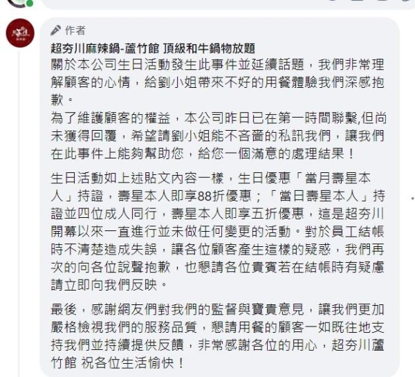 關於本公司生日活動發生此事件並延續話題,我們非常理解顧客的心情,給劉小姐帶來不好的用餐體驗我們深感抱歉。