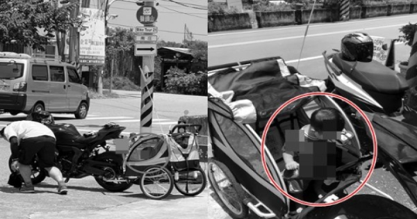 照片顯示,該名父親將兩輪的嬰兒車加裝在重機的後方,以拖行的方式前進,