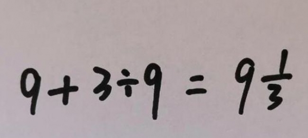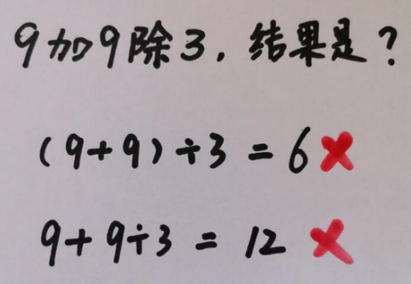 小亮的母親給孩子輔導作業的時候,遇到了這樣一個題目,9加9除3結果是多少?