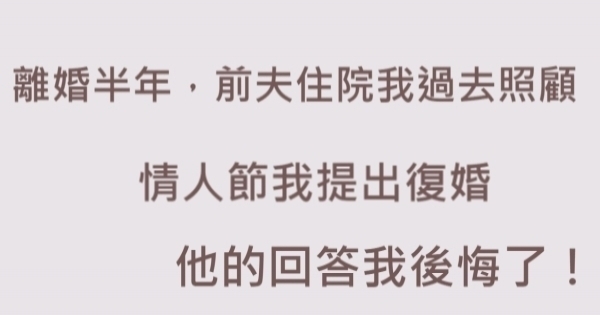 我聽了挺緊張,婆婆身體不好,前夫一個人在醫院沒法生活,想來想去我就請假去照顧他。我在醫院待了8天,我們彷彿又回到初戀的時候,從前夫的眼神中,我又看到了愛意,這時候有朋友來探望,他們趁機撮合我們,說夫妻還是原配的好,我想來想去,決定在520情人節這天提复婚。沒想到前夫的回答讓我慌了,