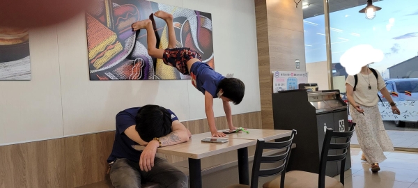 18:40提早過來等待後便靜靜地刷手機,而過沒多久便看到斜對面的小朋友做出脫軌的動作。原本以為我的前一桌客人和這桌的家長是熟人,所以我靜靜地看,但在等待的過程中,這小朋友不只一次做出這動作,卻沒有人喝止......